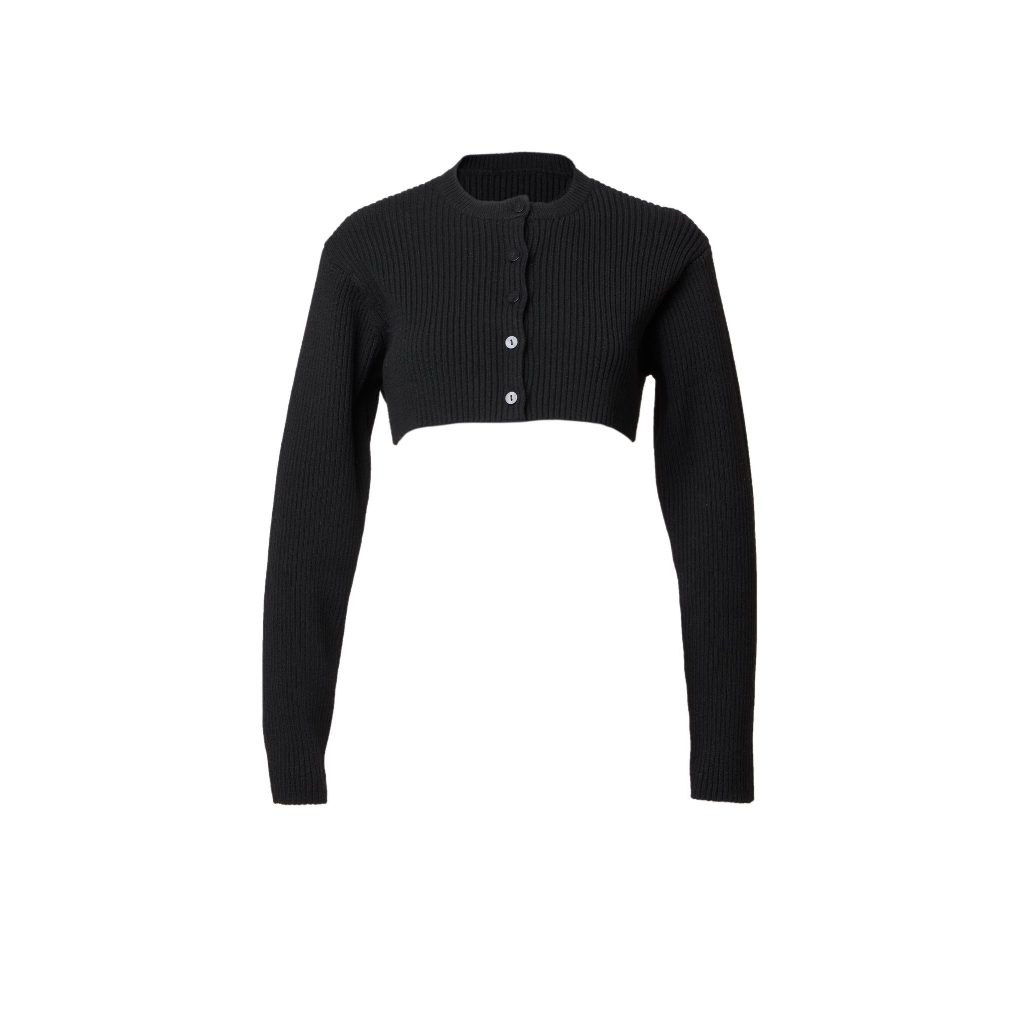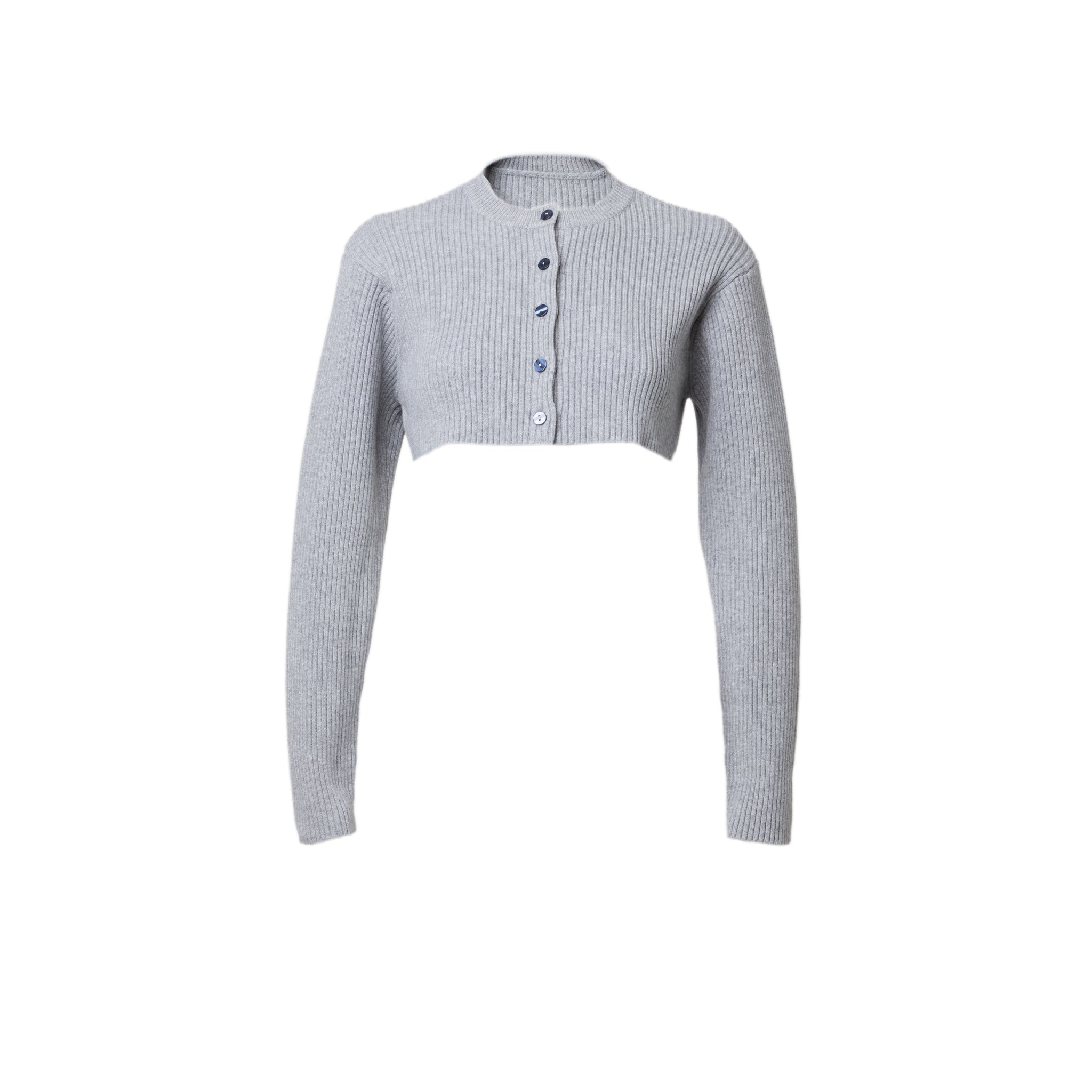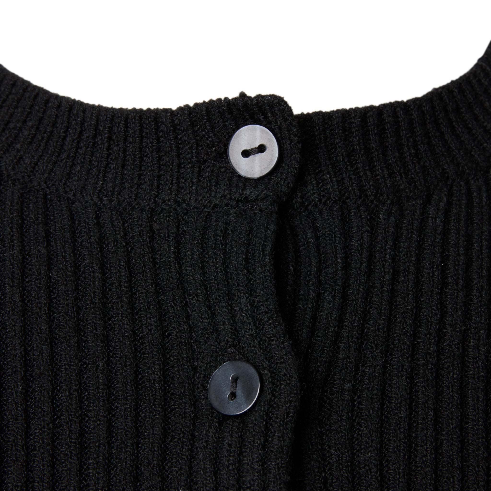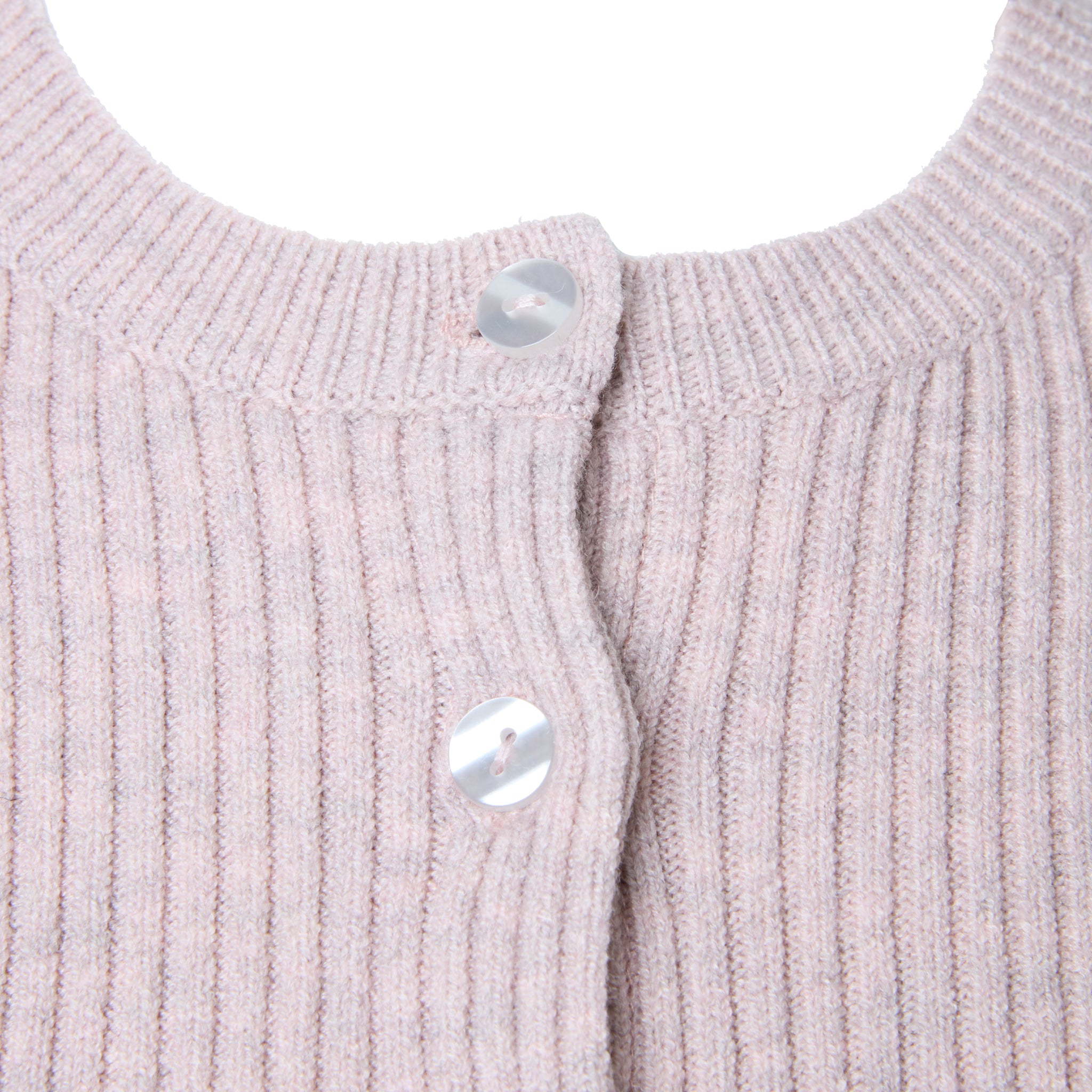 ソフトタッチの糸を使用し程よい膨らみ感があるリブ編みのクロップ丈のカーディガン。