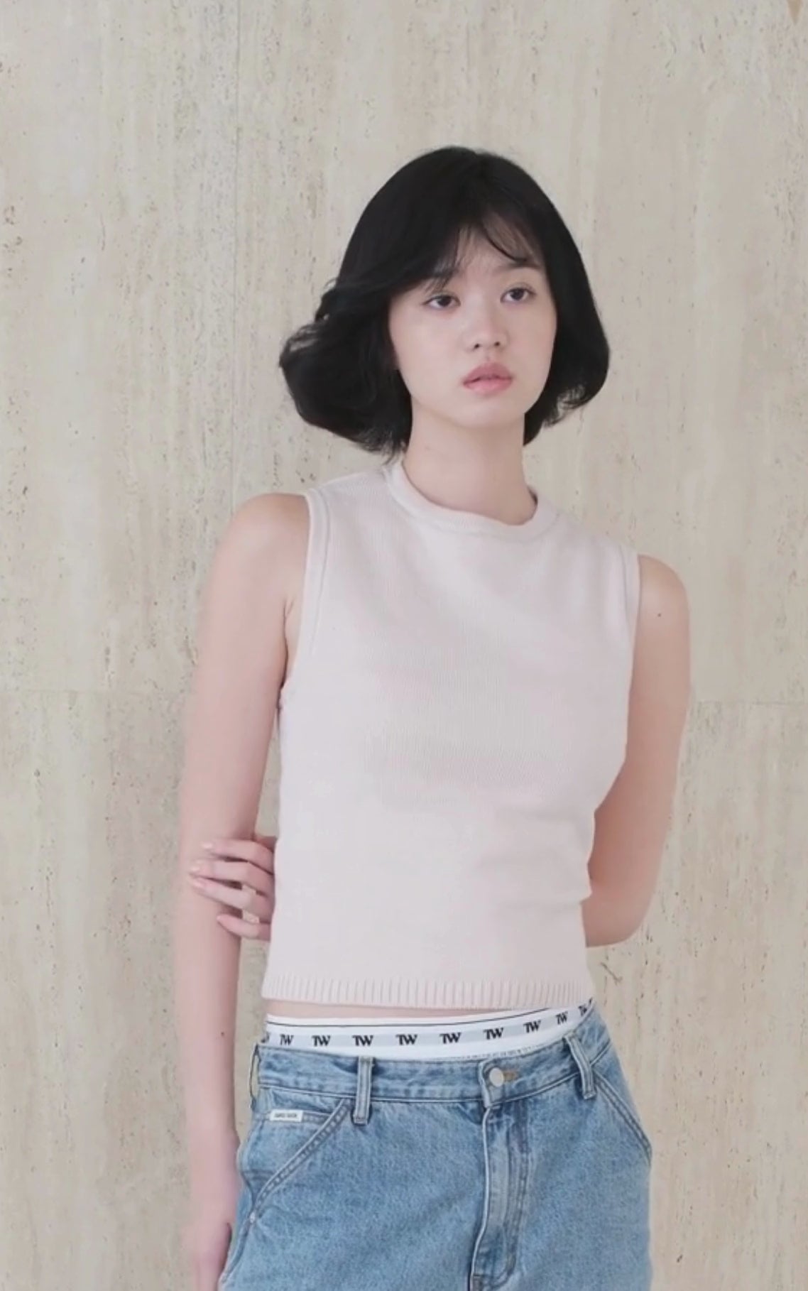 부드러운 표정의 뜨개질과 중육 니트 소재의 탑스.