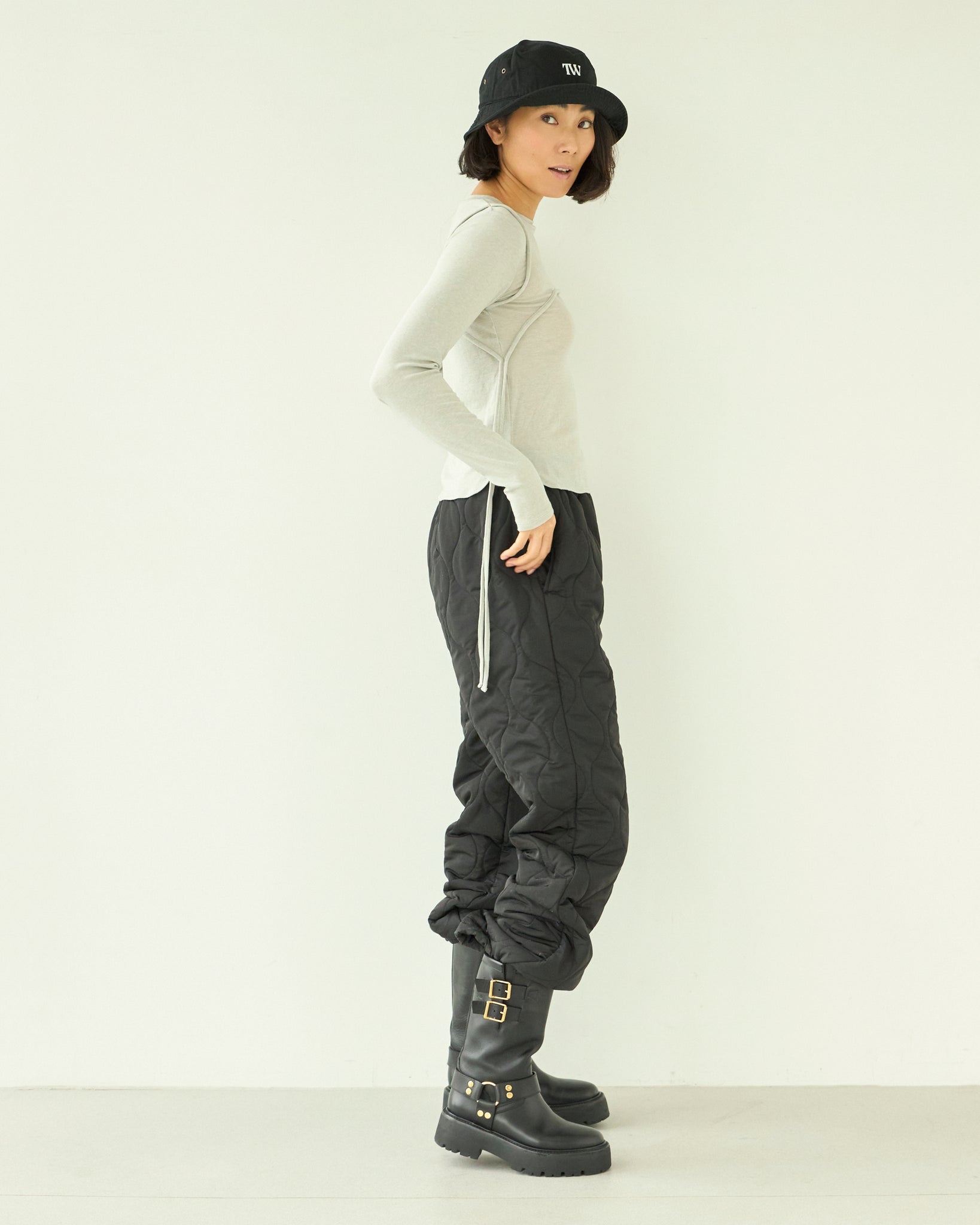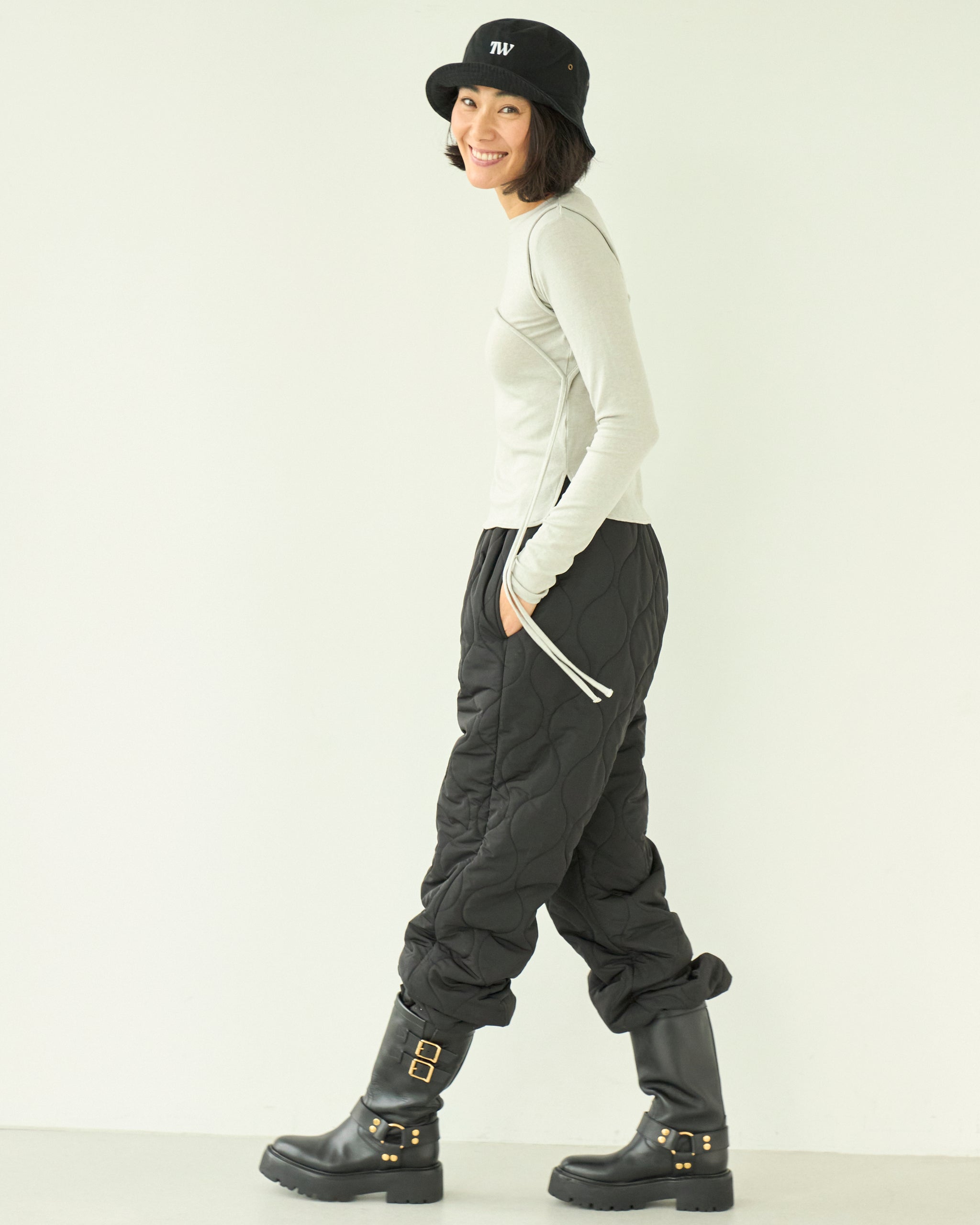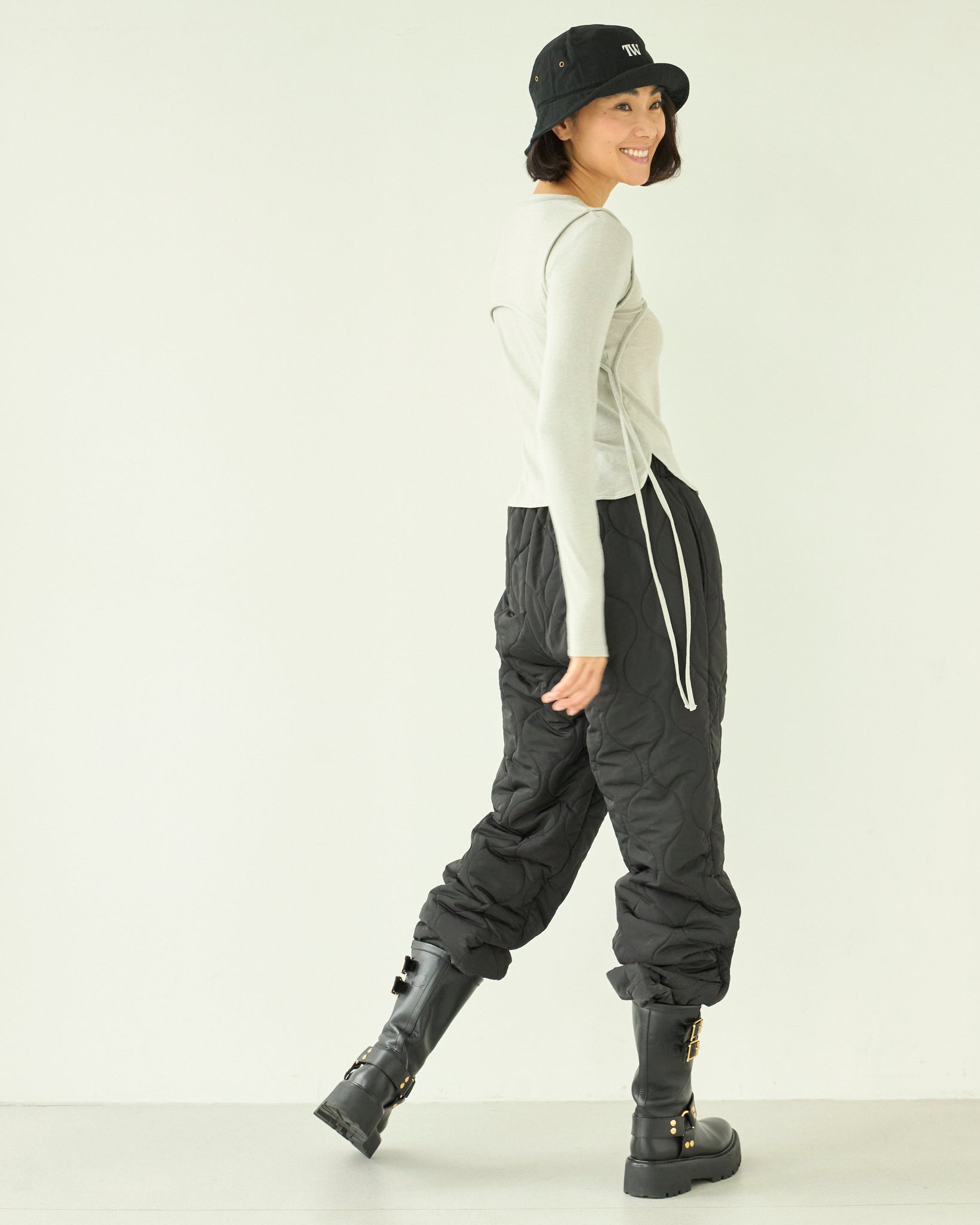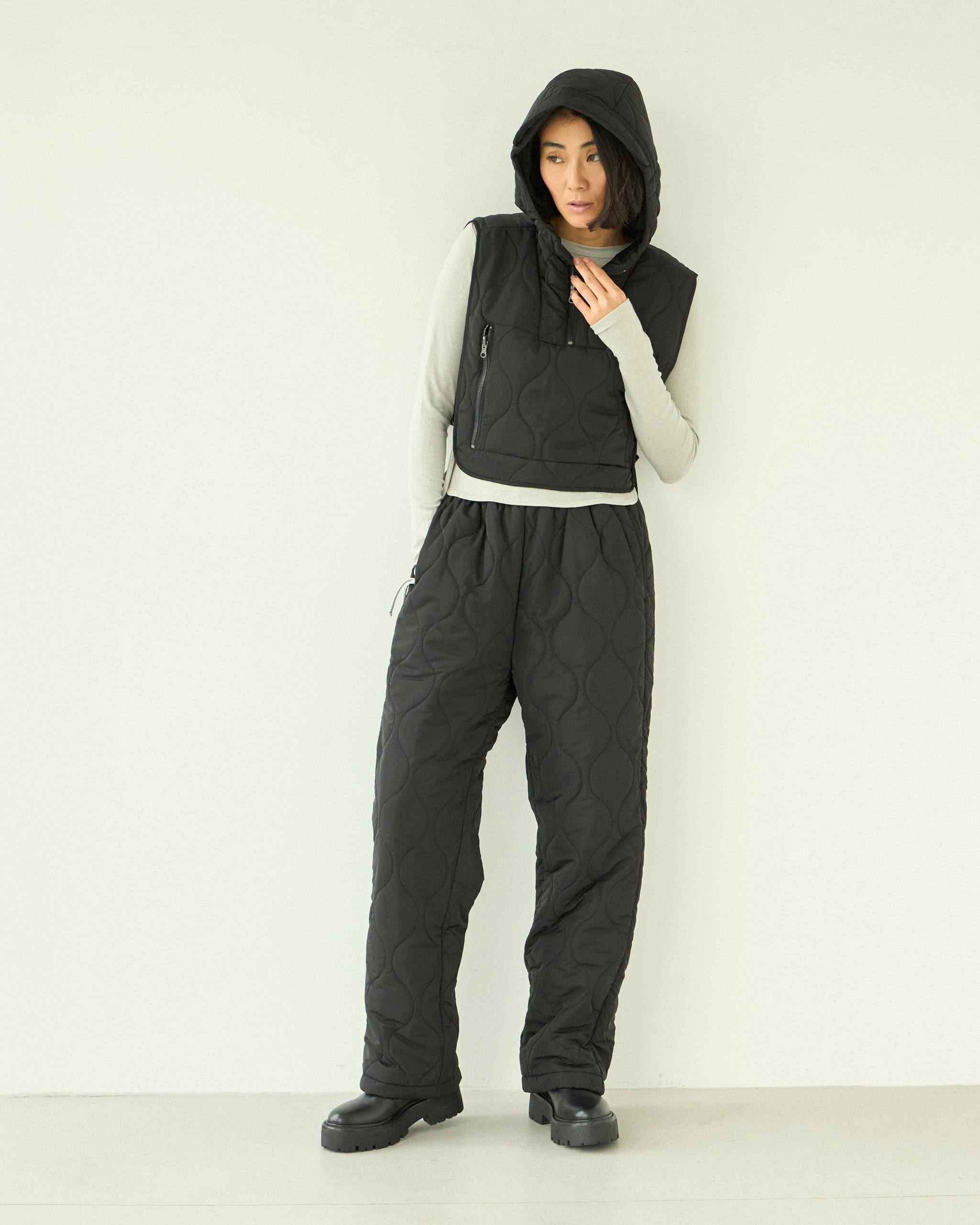 안솜 퀼트 가공된 나일론 원단의 캐주얼 Nylon Quilt Pant. 허리는 고무 사양, 겨드랑이 심 포켓, 밑단은 스핀들과 스토퍼로 짜서 신는 것도 귀엽습니다. 이 소재의 Nylon Quilt Vest 와 SETUP 코데 가능합니다. 표 원단은 발수 가공.