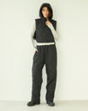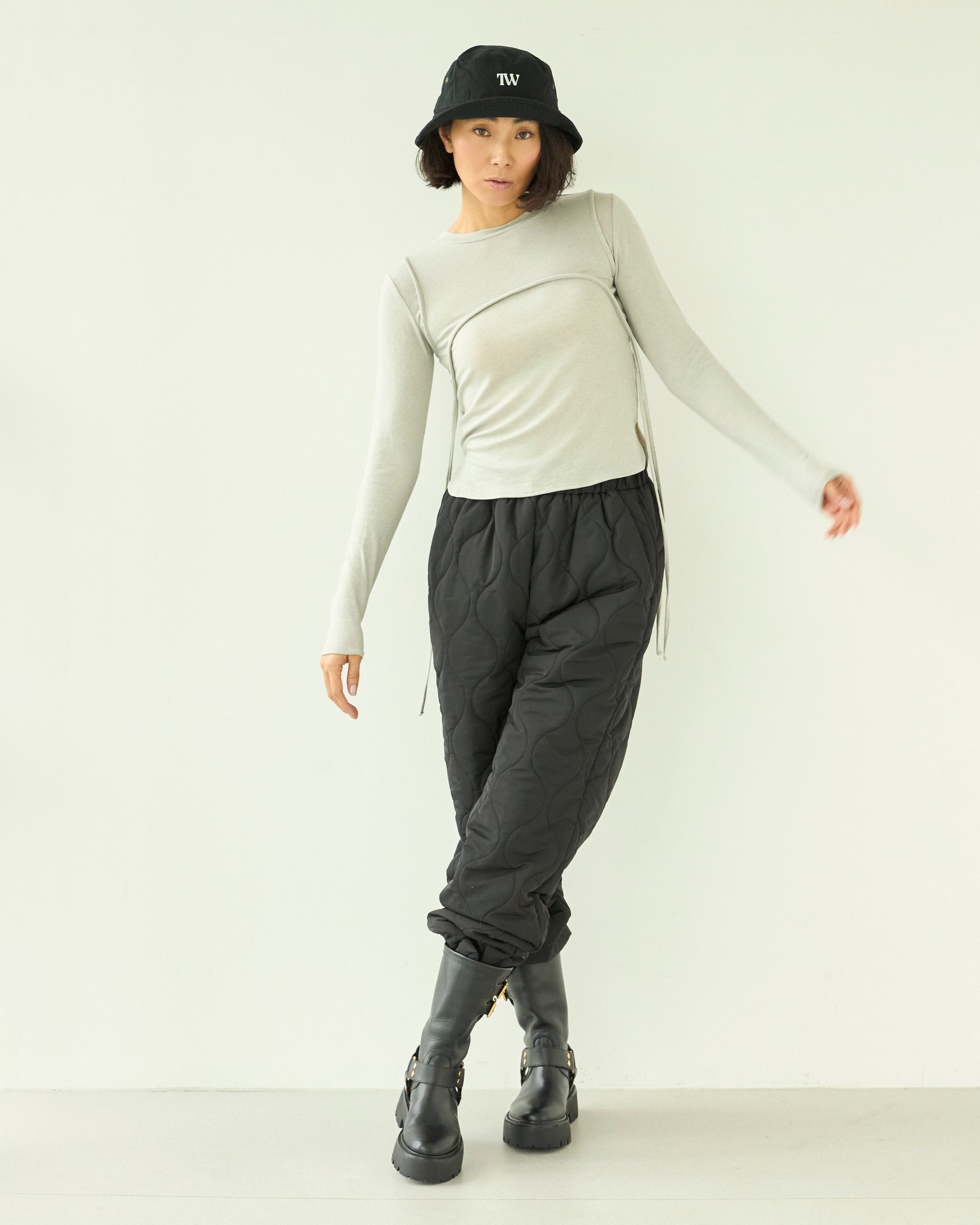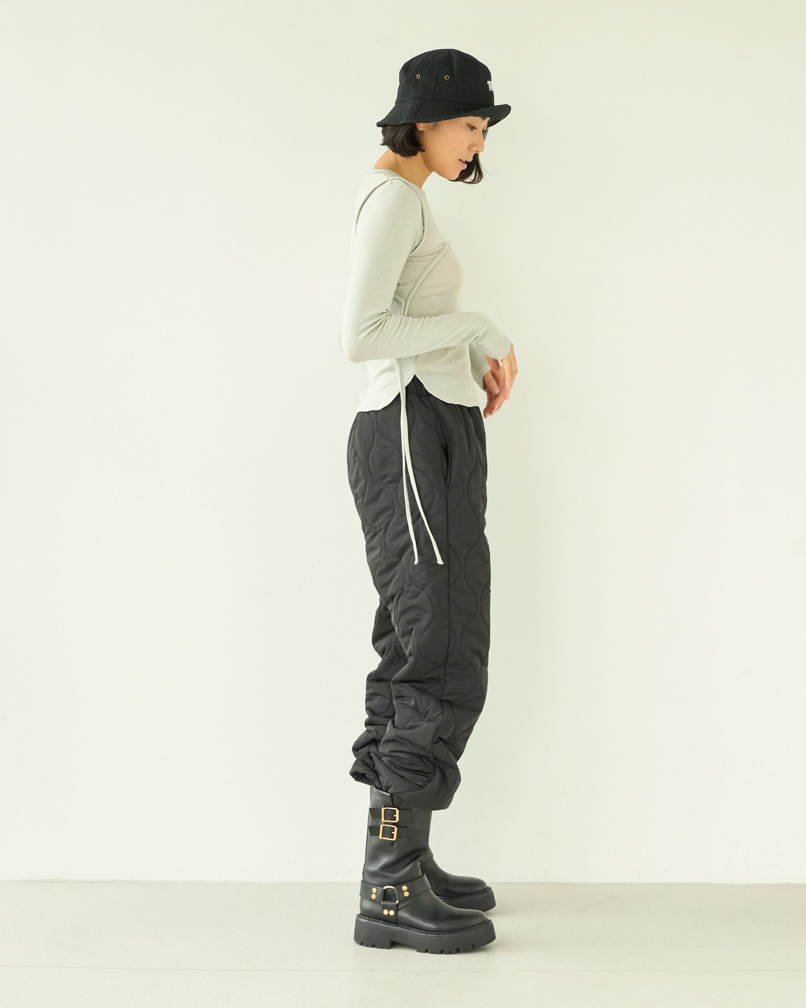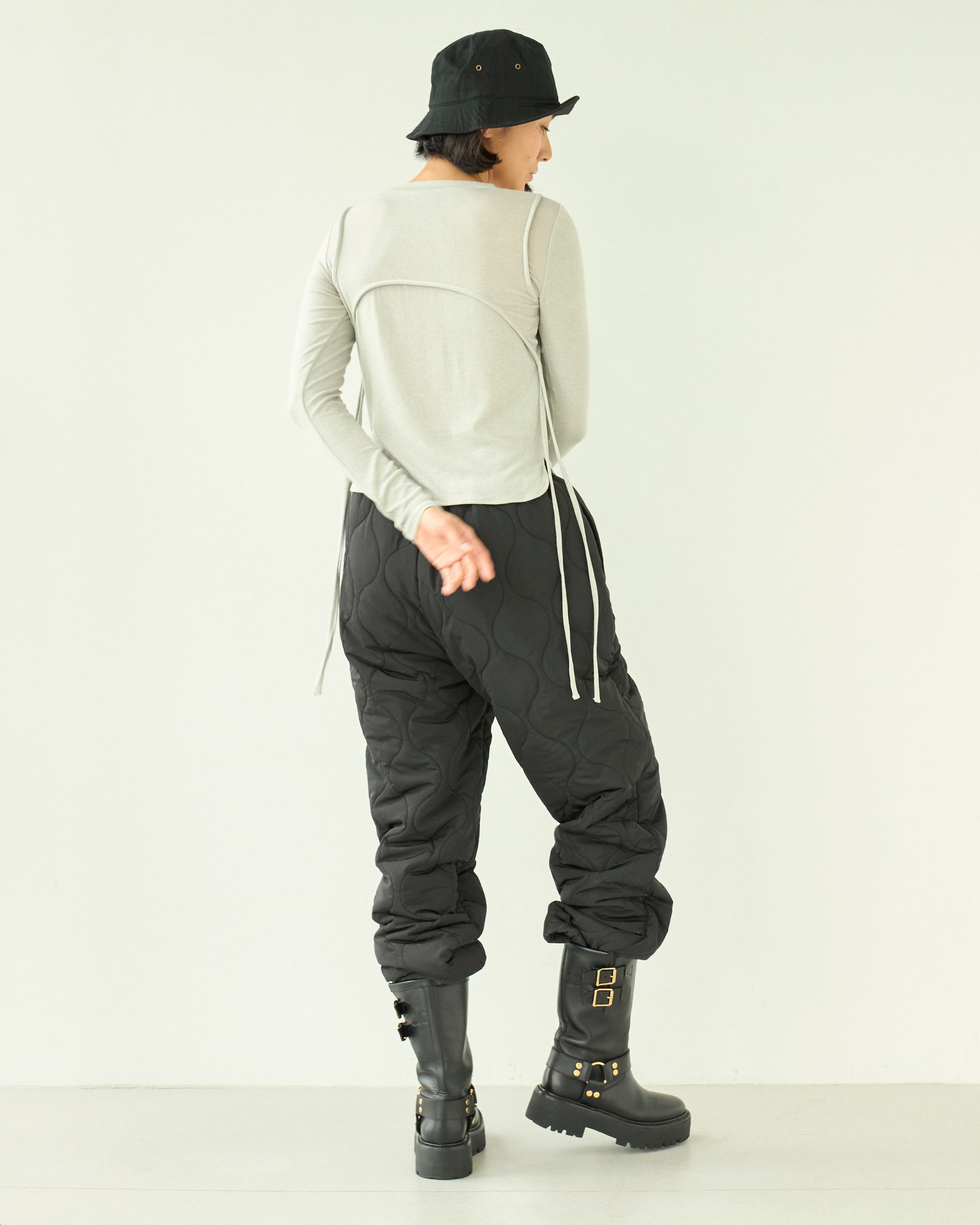 안솜 퀼트 가공된 나일론 원단의 캐주얼 Nylon Quilt Pant. 허리는 고무 사양, 겨드랑이 심 포켓, 밑단은 스핀들과 스토퍼로 짜서 신는 것도 귀엽습니다. 이 소재의 Nylon Quilt Vest 와 SETUP 코데 가능합니다. 표 원단은 발수 가공.