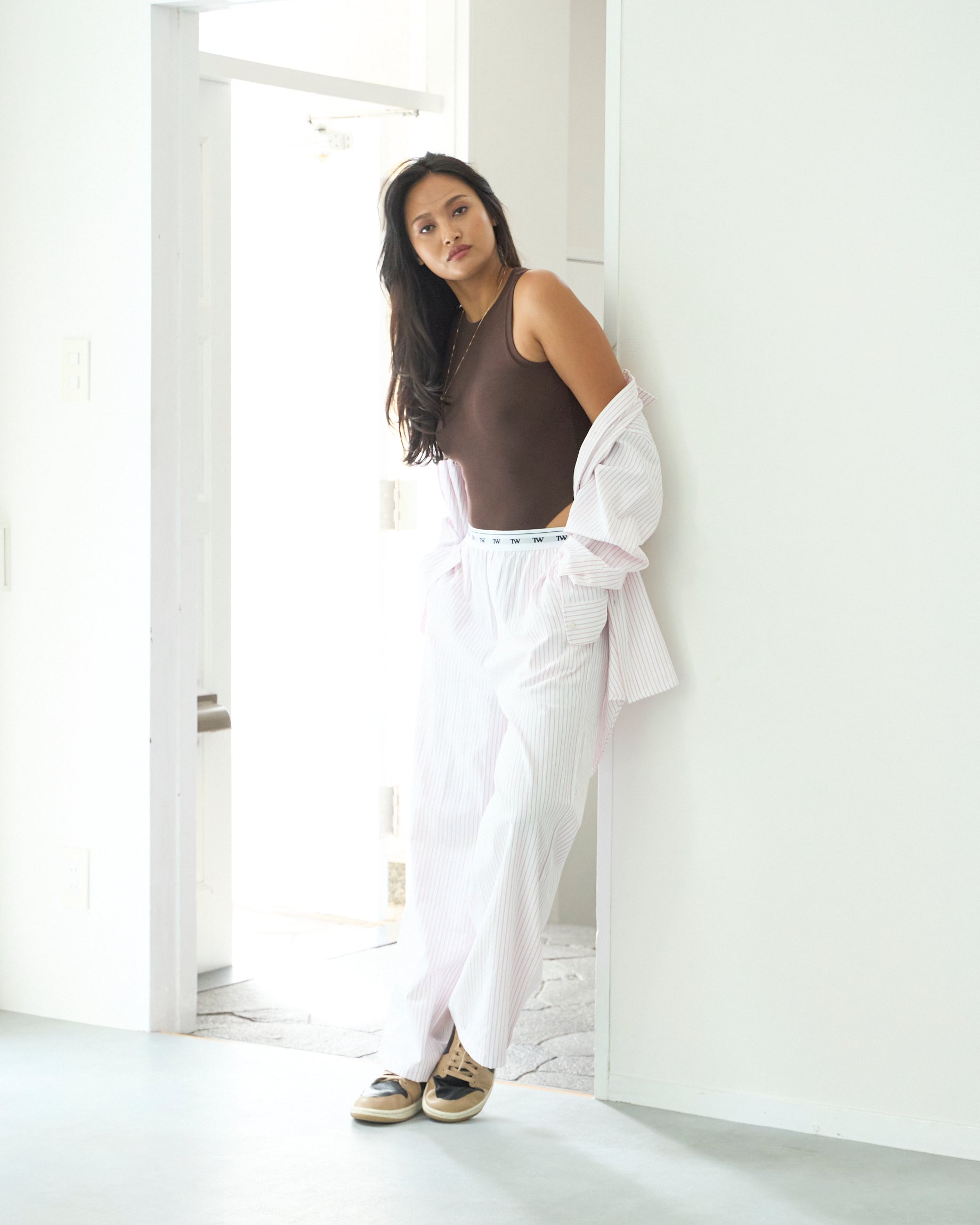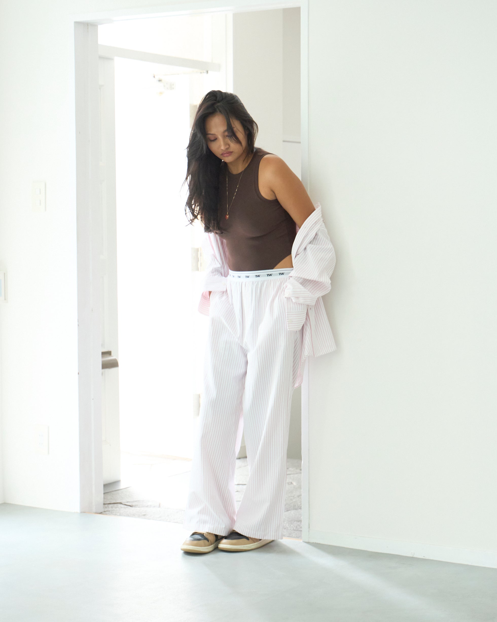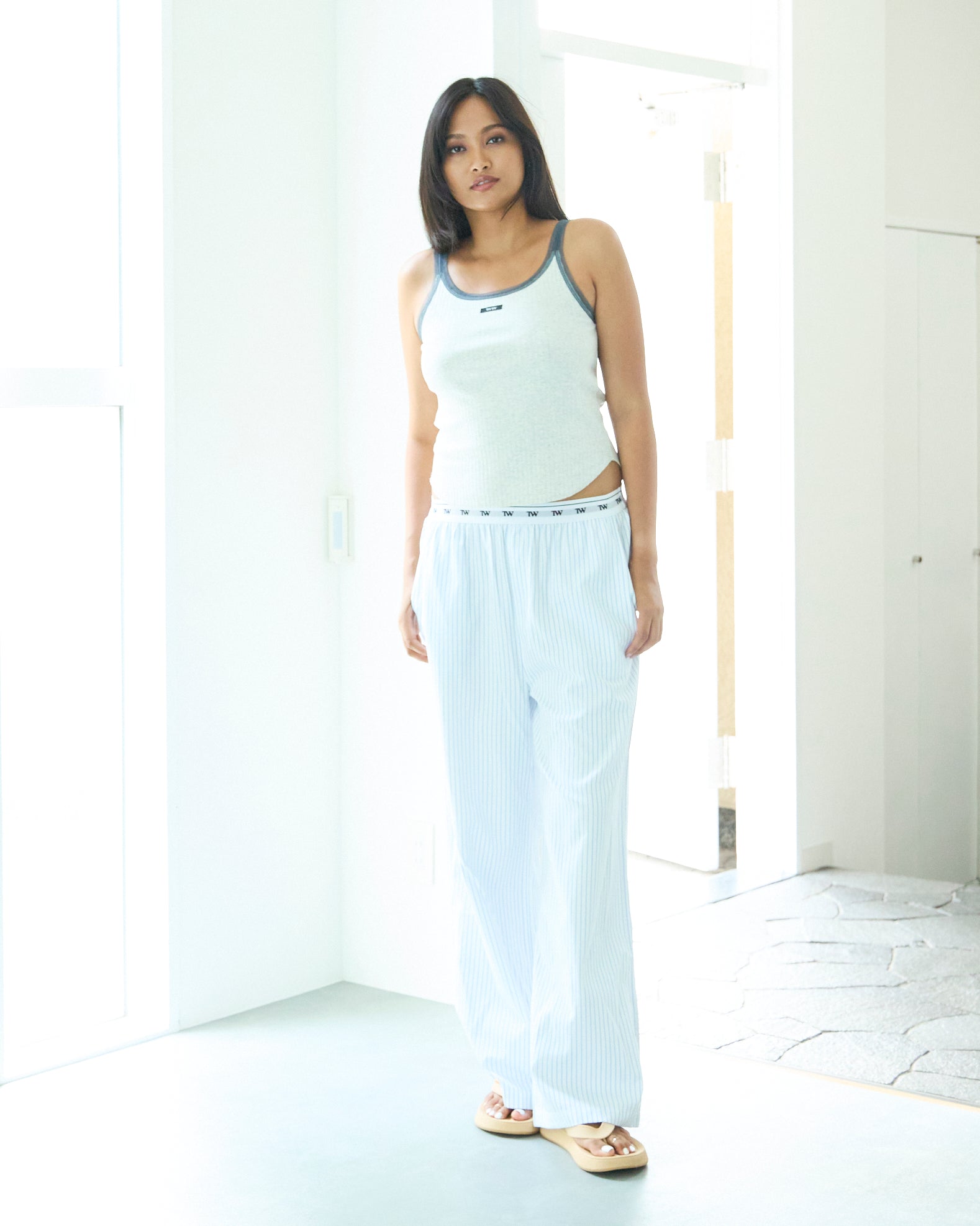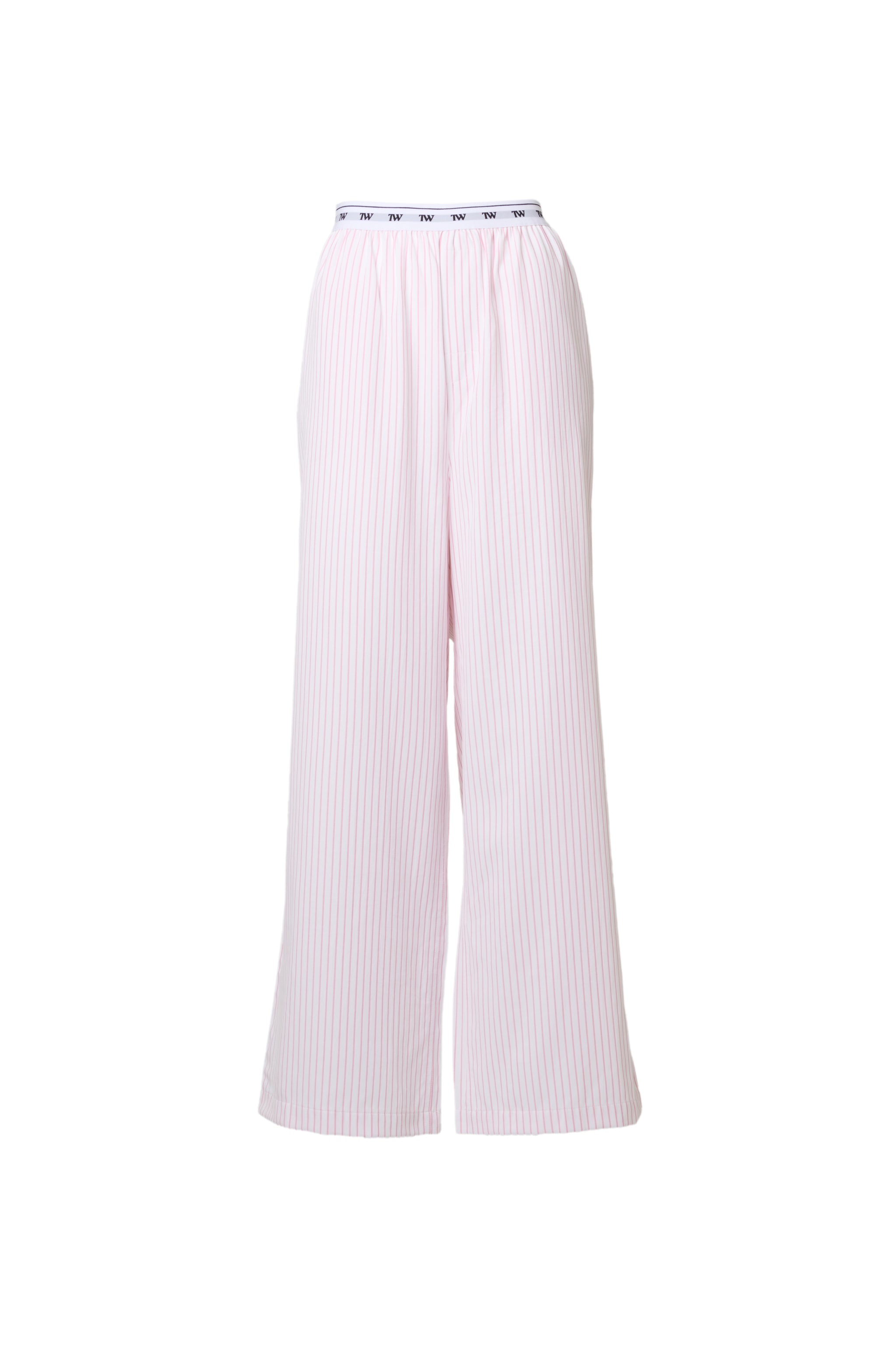 抜け感のあるリラックスパンツは、ストライプとウエストロゴの相性抜群。