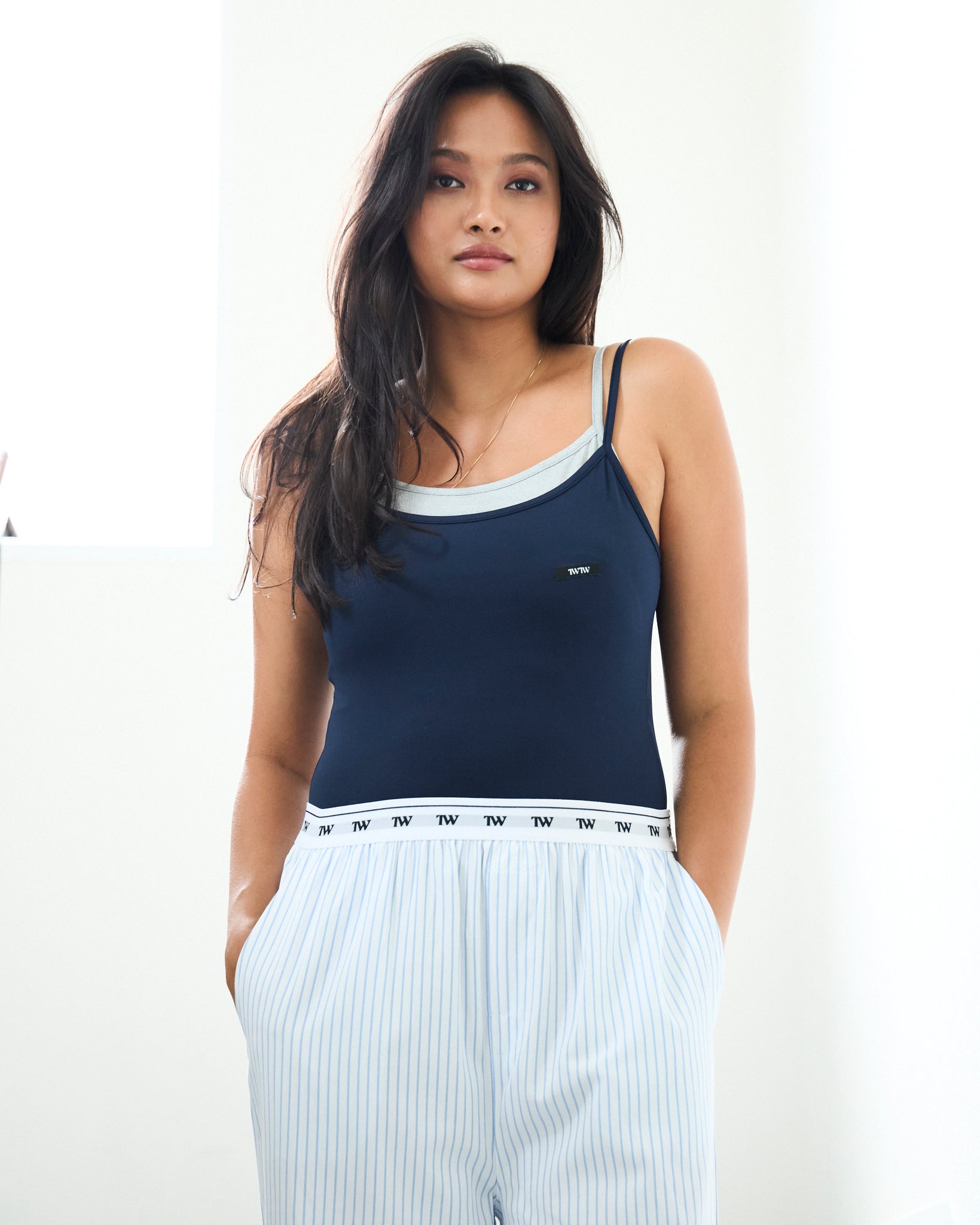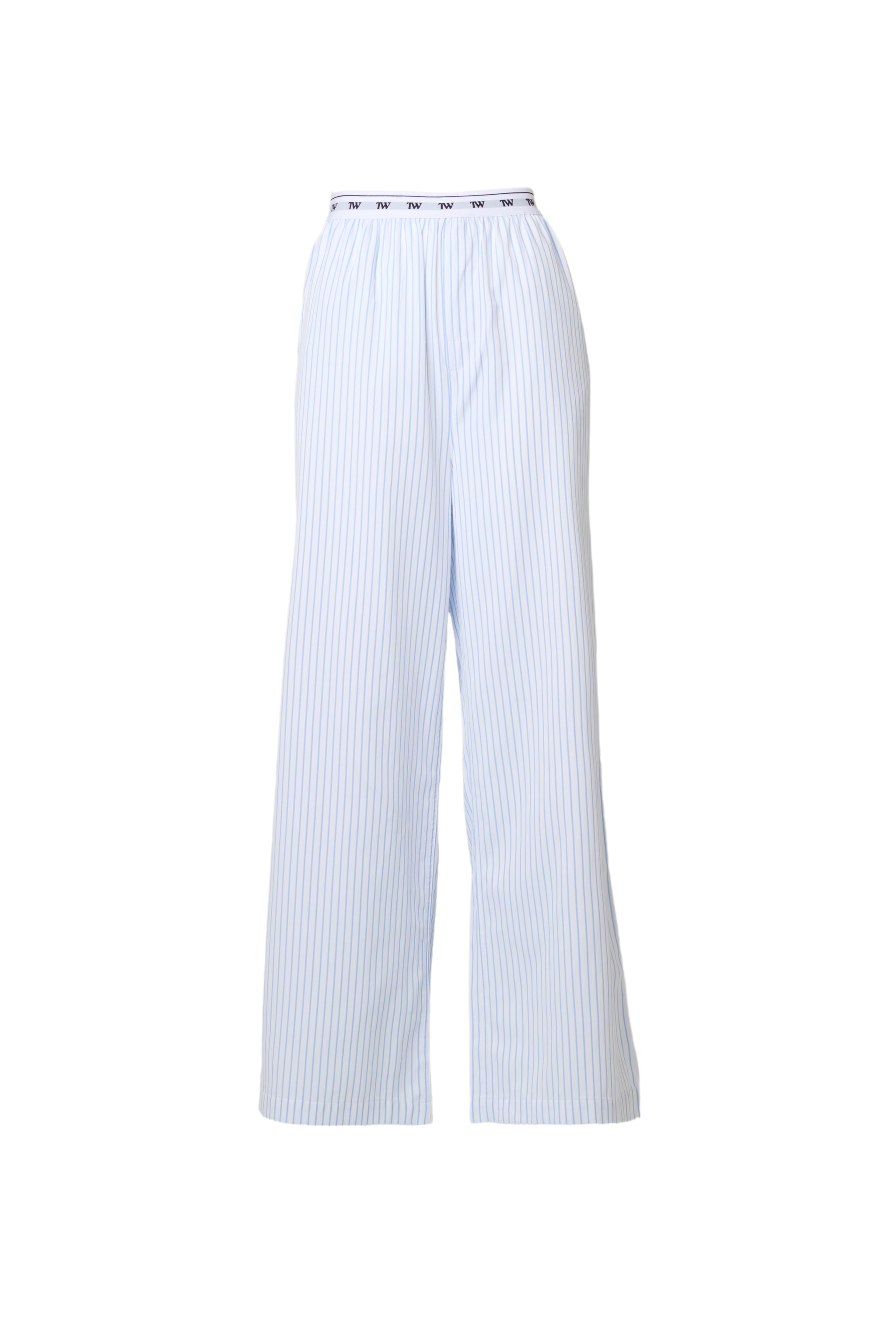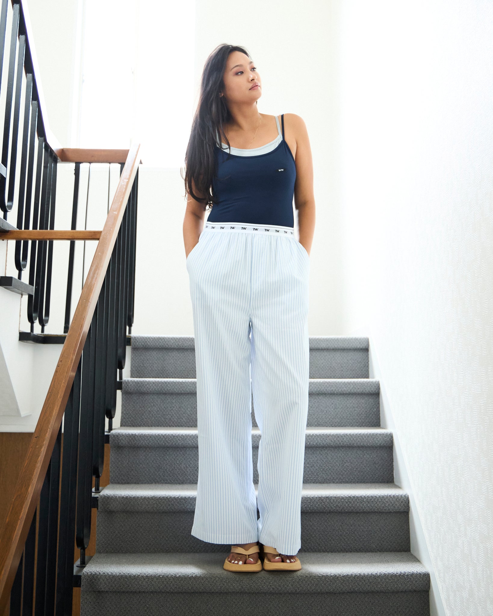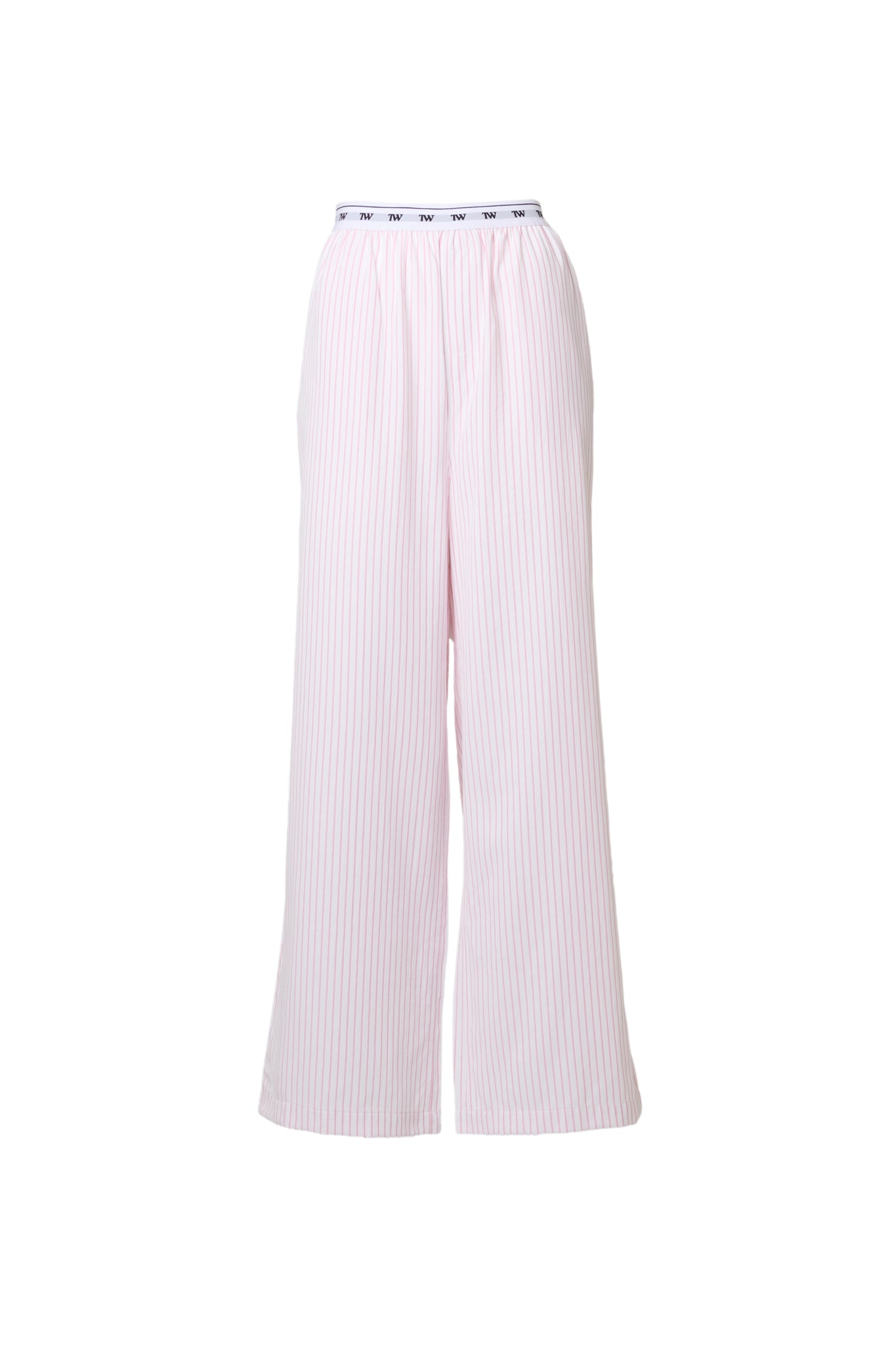抜け感のあるリラックスパンツは、ストライプとウエストロゴの相性抜群。