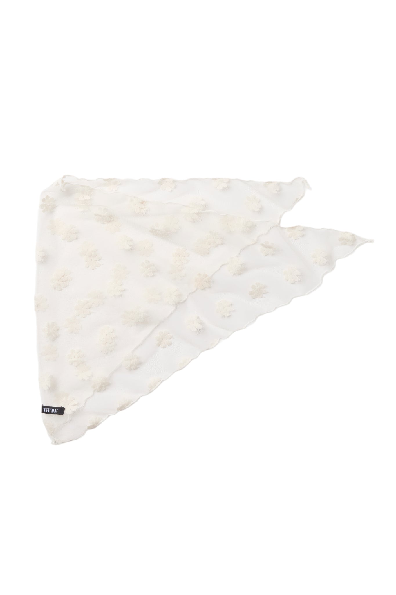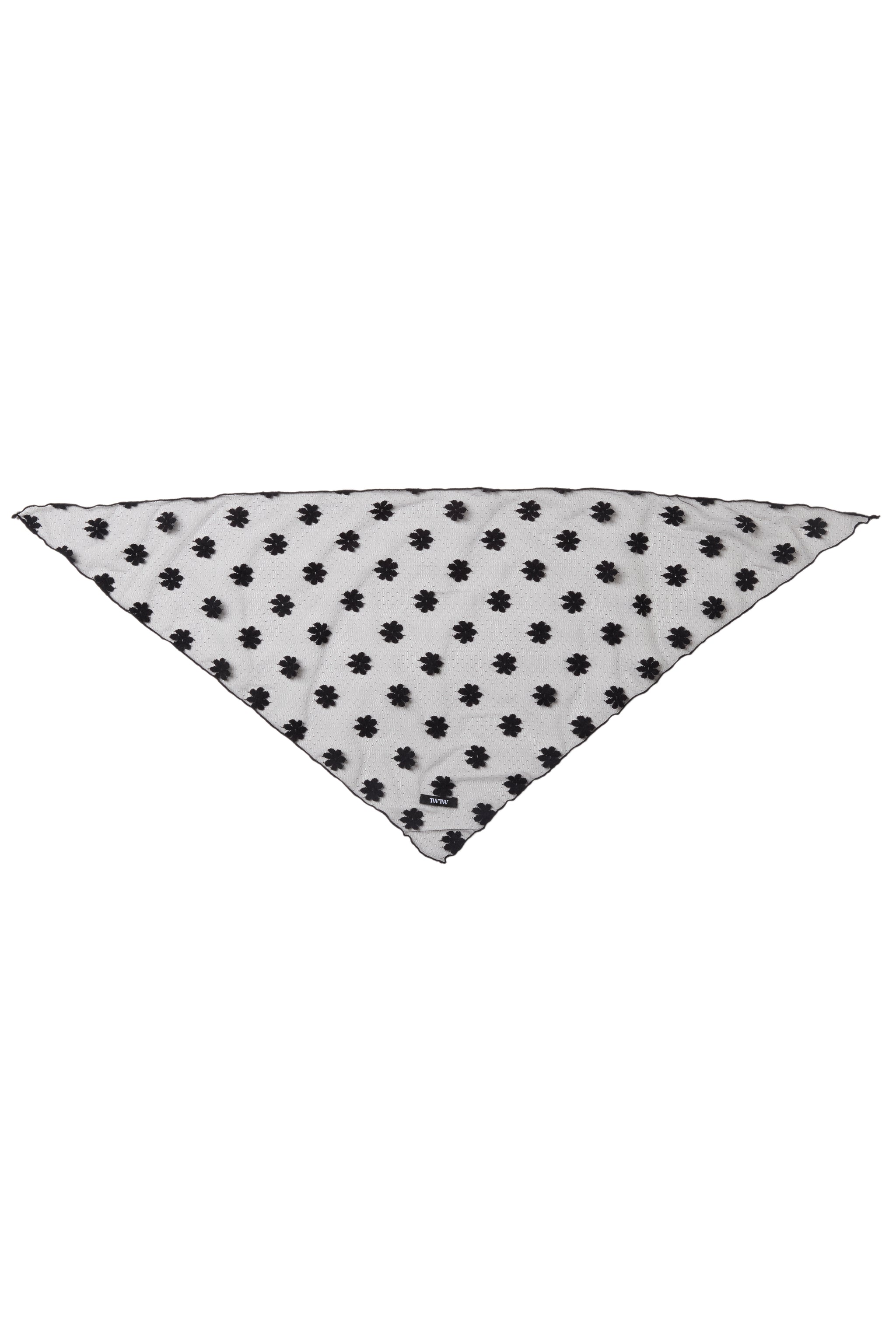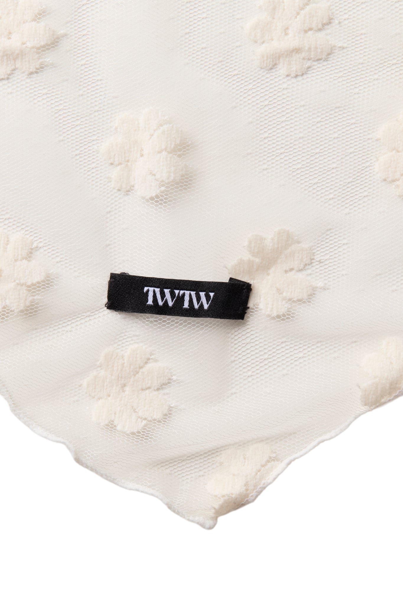 チュール素材のバブーシュカ。全体に入った花柄の刺繍がポイントで透け感があり、軽やかな印象です。TWのロゴも入り。