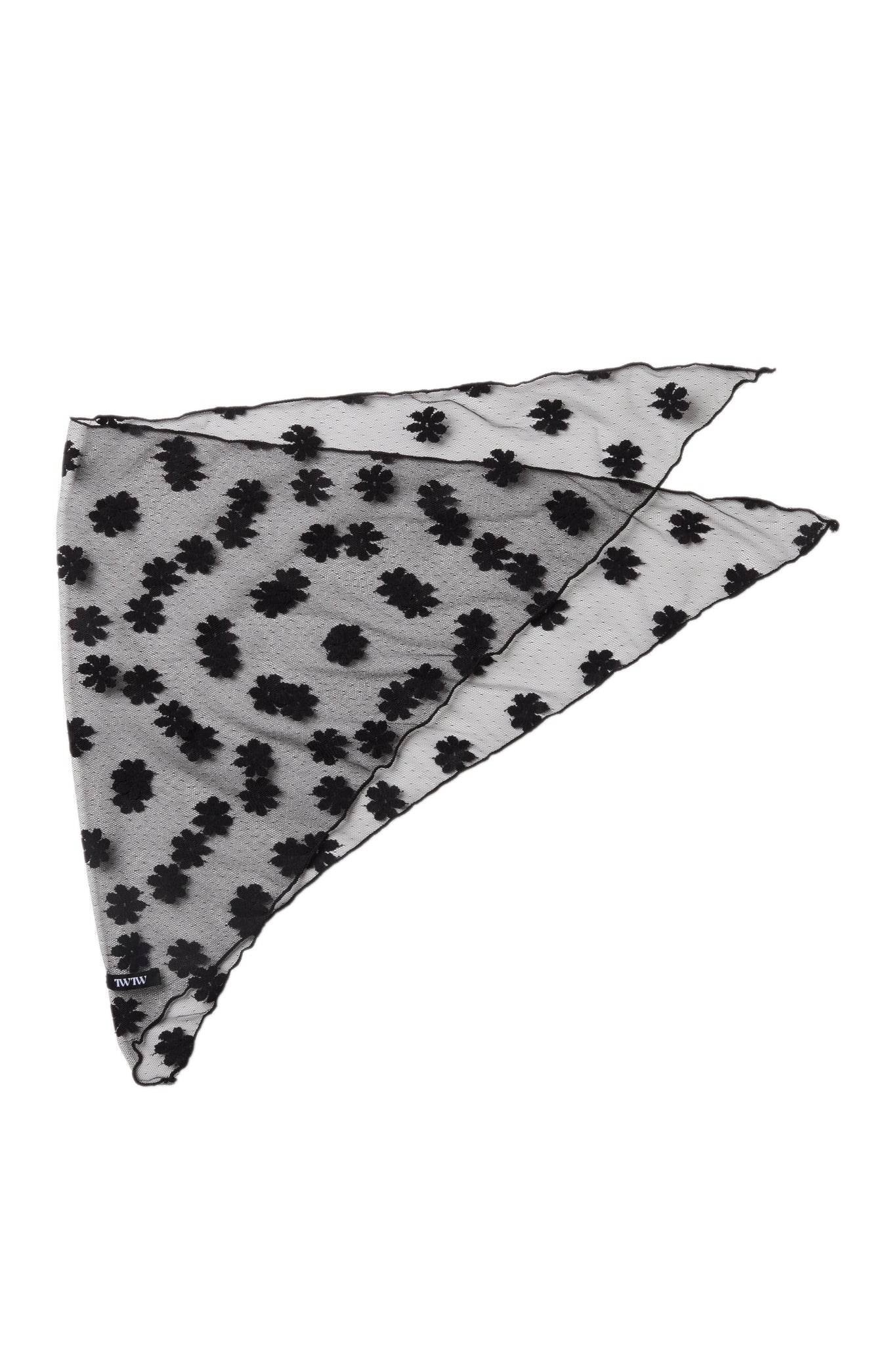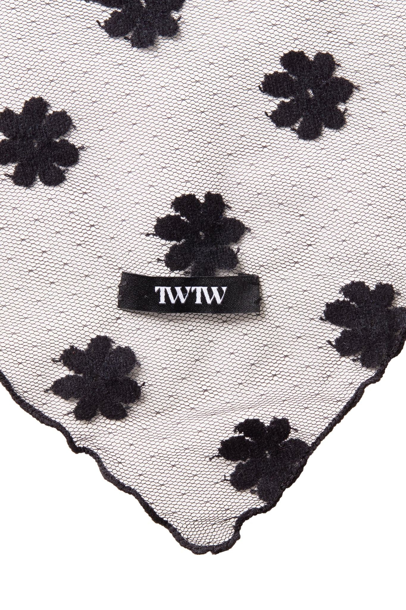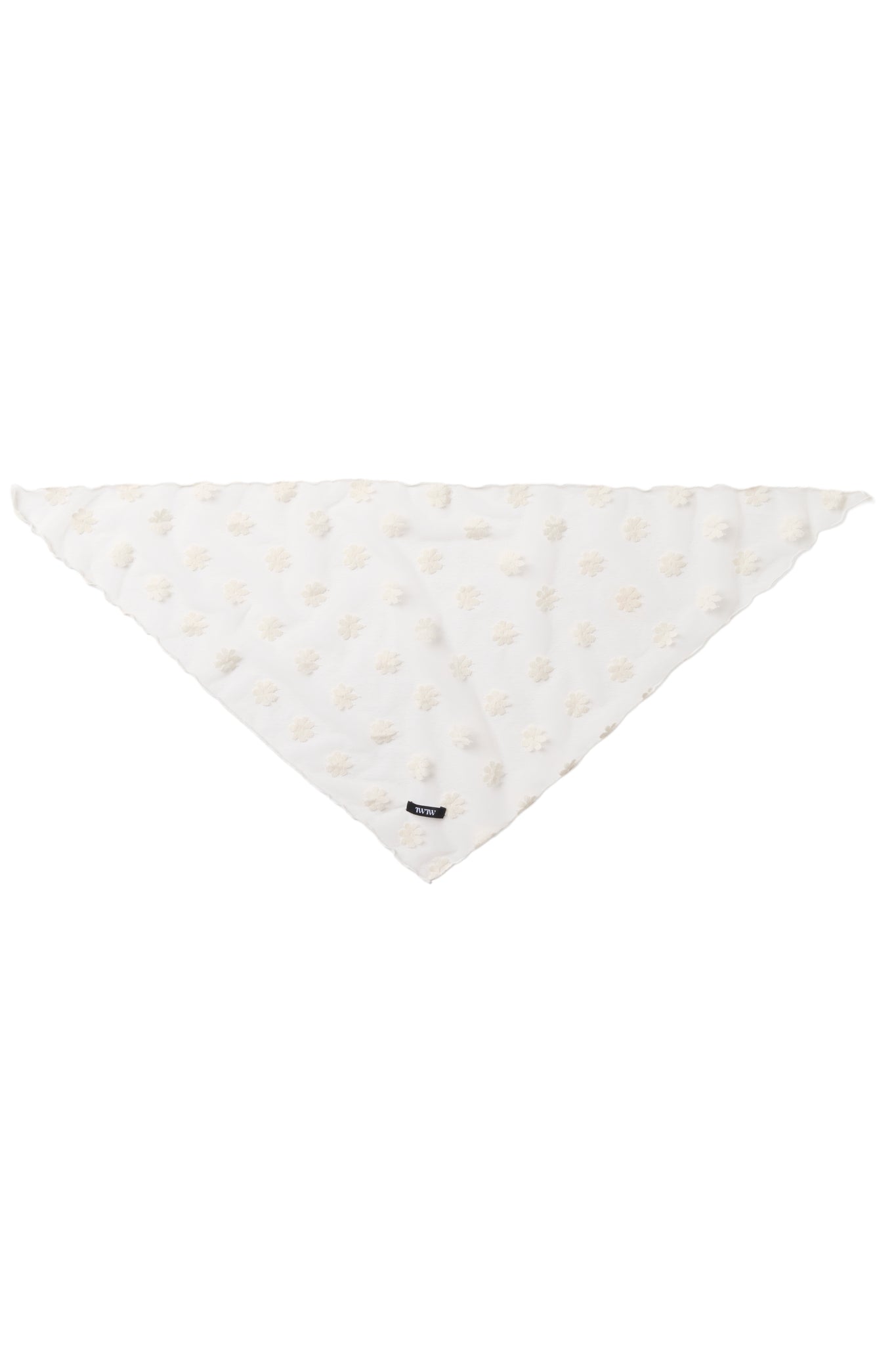 チュール素材のバブーシュカ。全体に入った花柄の刺繍がポイントで透け感があり、軽やかな印象です。TWのロゴも入り。