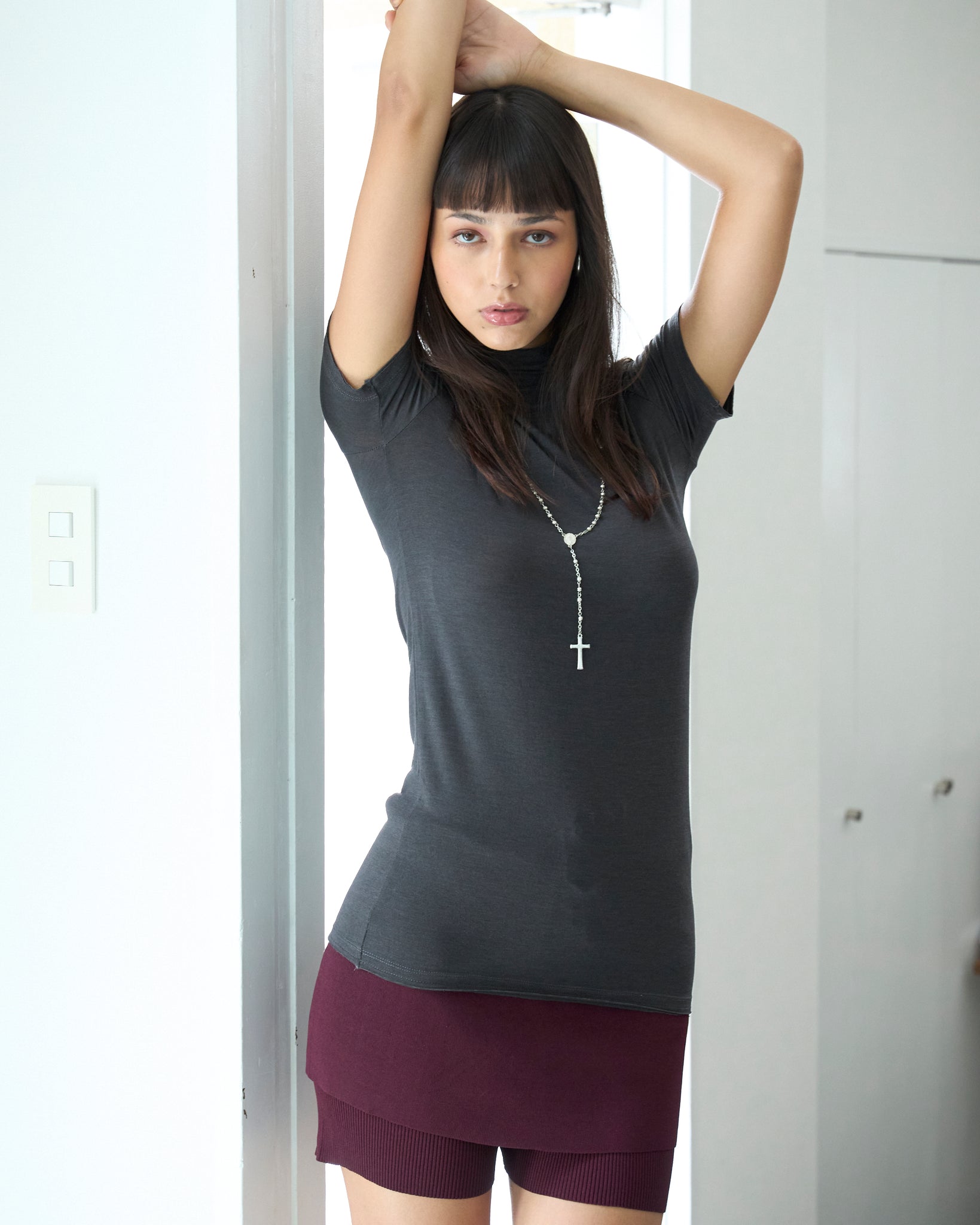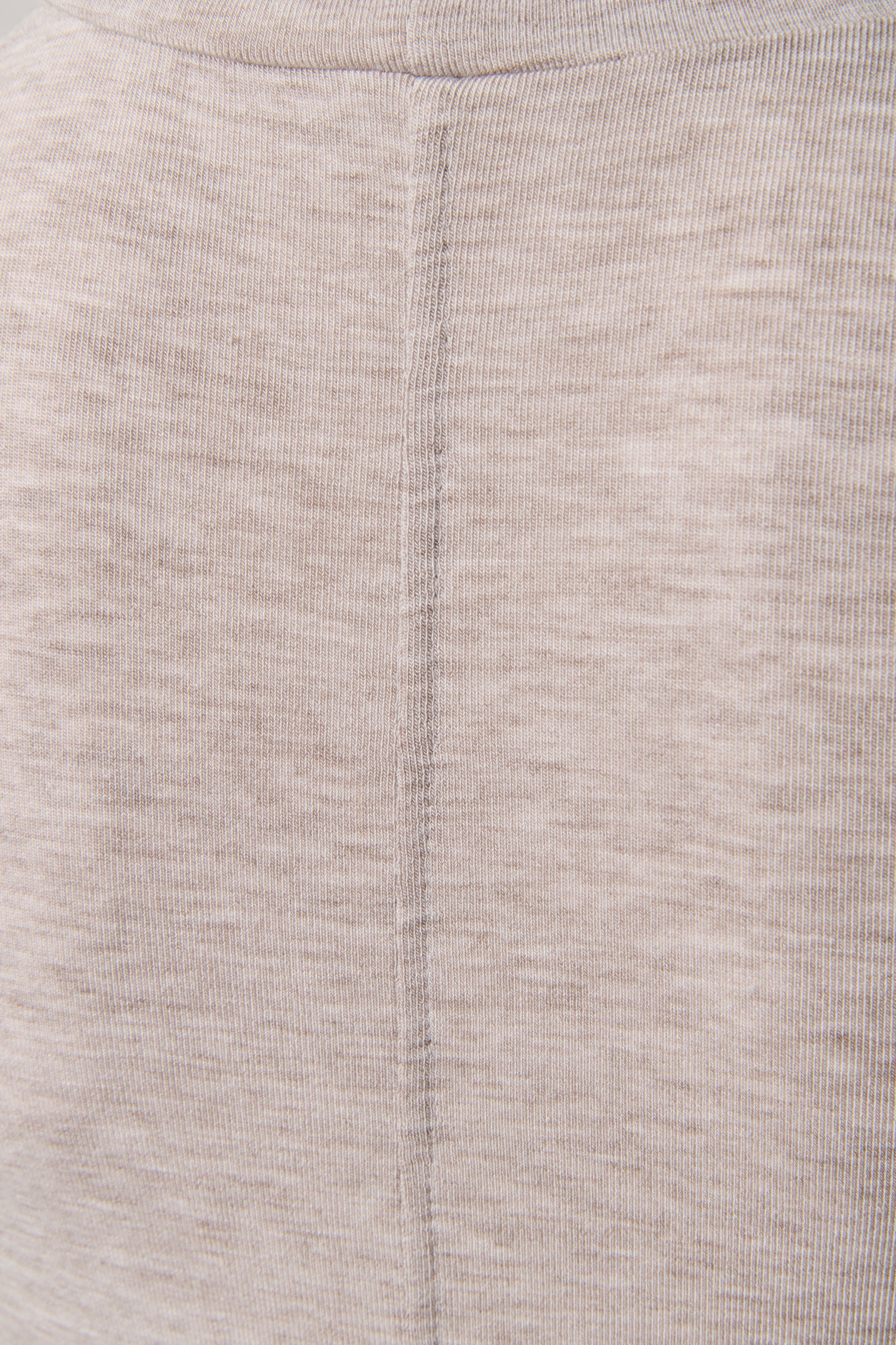 やや透け感があり伸縮性に優れた、滑らかな肌触りが特徴の素材を使用したトップス。着丈は長めなのでチュニックとしても着回しが可能。