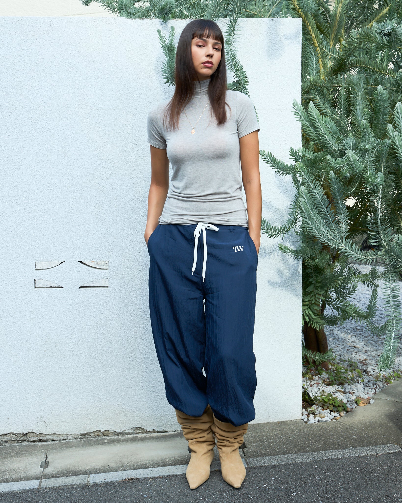 裾口や袖口、ハイネック部分は切りっぱなしになっており、さりげないこなれ感あるデザインがポイント。